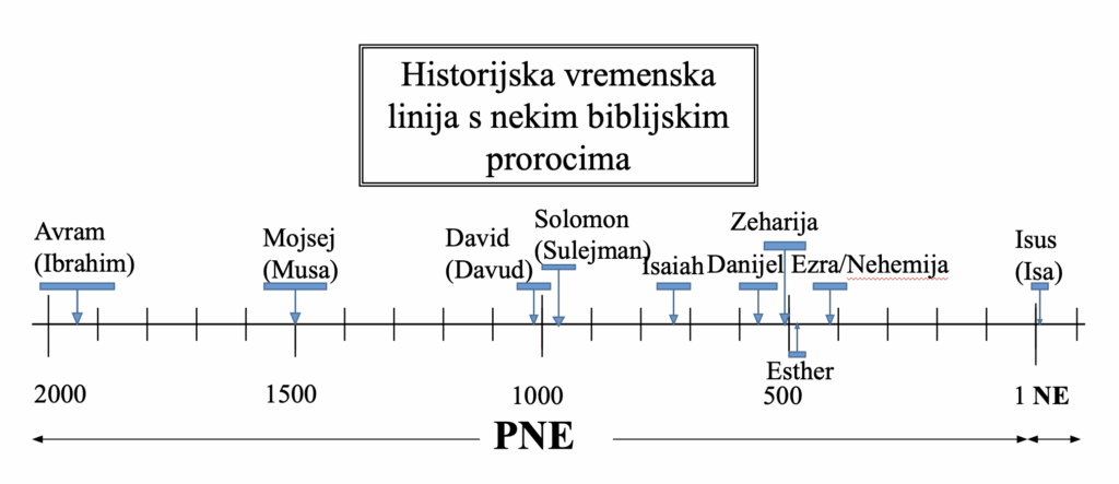 Da bi nam pomogao da bolje ‘vidimo’ proroke i njihove knjige kroz istoriju, neke sam (ne sve zato što nema dovoljno mjesta) stavio na istorijsku vremensku liniju. Ono što se ističe je veoma dug period ljudske istorije koji pokriva ova vremenska linija. Otkucaji (ili jedinice) vremena u ovoj vremenskoj liniji mjere stoljeće (godine po 100-ima)! Zelene horizontalne trake pokazuju životni vijek tog određenog proroka. Vidite da su Ibrahim (Abraham) i Musa (Mojsije) živjeli mnogo godina!